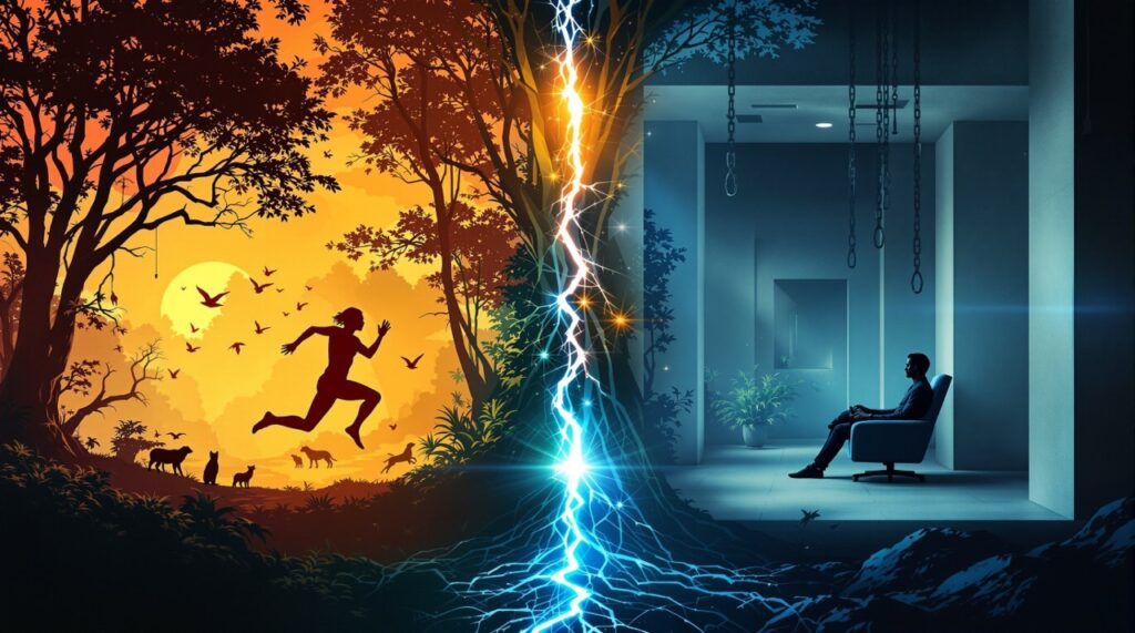 かつて、私たちの動物的・肉体的モードは、まさに生きるための精密な機械として機能していました。狩猟採集時代の人間は、一日に10キロメートル以上を歩き、重い獲物を担ぎ、木に登り、川を泳ぎ、全身の筋肉を駆使して暮らしていました。獲物を追いかける本能的な衝動、危険を察知する野生の勘、自然の恵みを見つける直感—これらすべてが生存に直結し、身体は躍動する生命そのものでした。