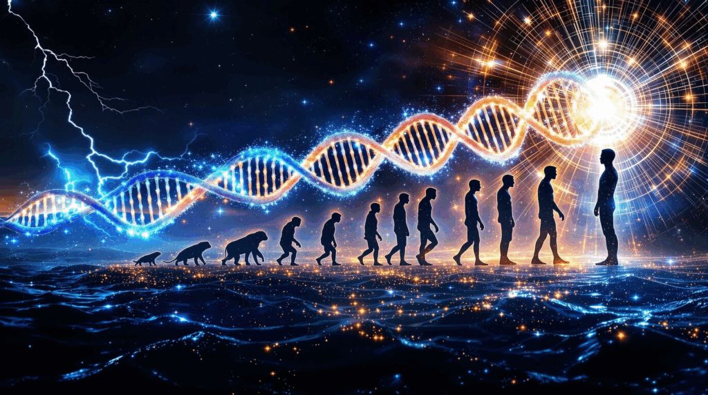 ここで、肉体と精神の最初の「共進化」が始まりました。DNAの偶然の変異(情報の変化)が、細胞の構造や機能を変え(肉体の変化)、その変化が環境への適応度を左右する—適応に成功した変異は次世代に受け継がれ、失敗した変異は淘汰される。